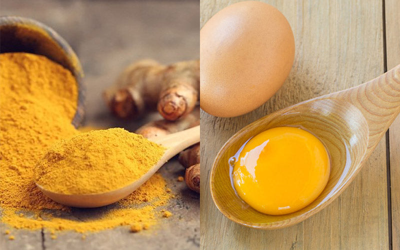 Trứng gà có chứa một hàm lượng collagen giúp ngăn chặn quá trình lão hóa da được diễn ra. Khi sử dụng kết hợp với bột nghệ sẽ kích thích tái tạo da bởi các thành phần như vitamin A, vitamin B, vitamin C, protein và khoáng chất khác.